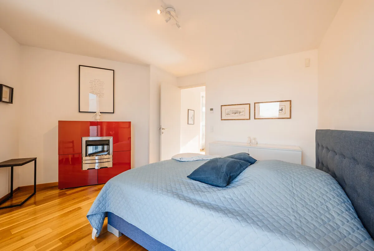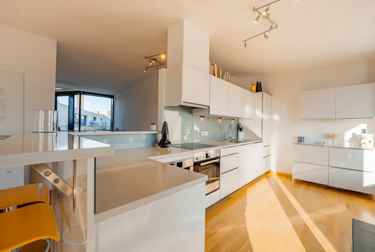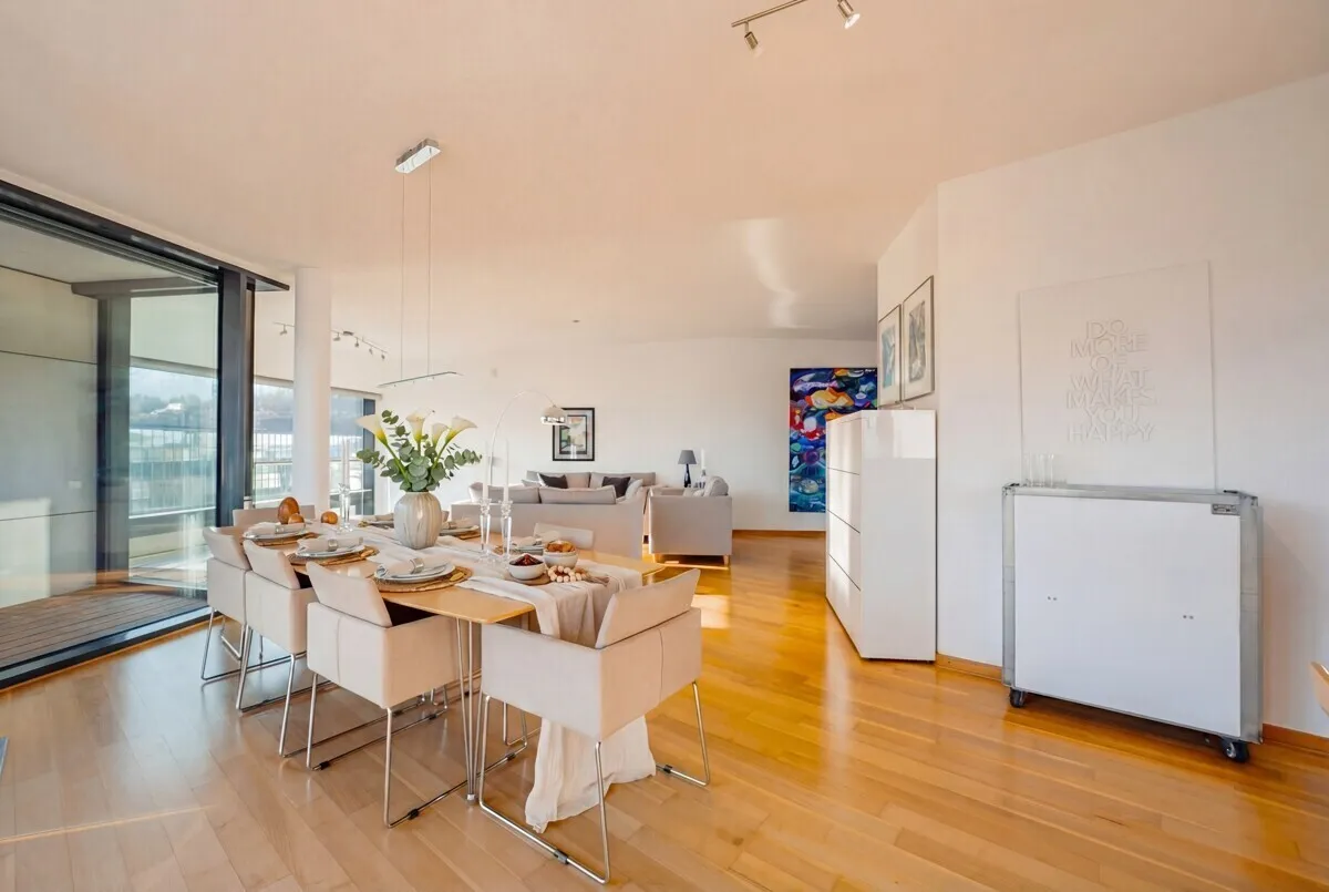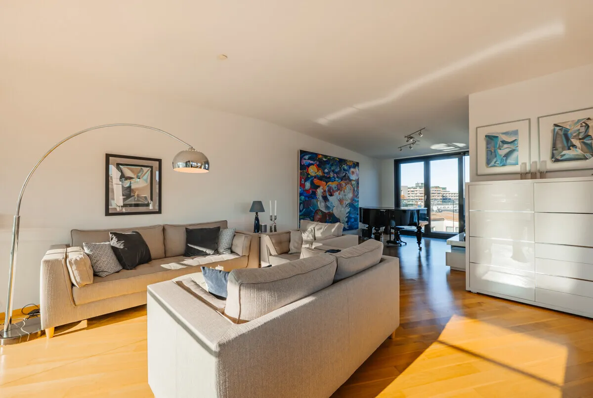 The top floor of approx. 74 m² forms the heart of the apartment, which can also be reached by elevator and where guests can be received directly without having to enter the private rooms. A light-flooded, spacious kitchen-dining-living area that ideally combines openness, living comfort and prestige. High-quality real wood parquet flooring lends the open-plan living areas a warm, inviting atmosphere and underlines the high standards of this property.