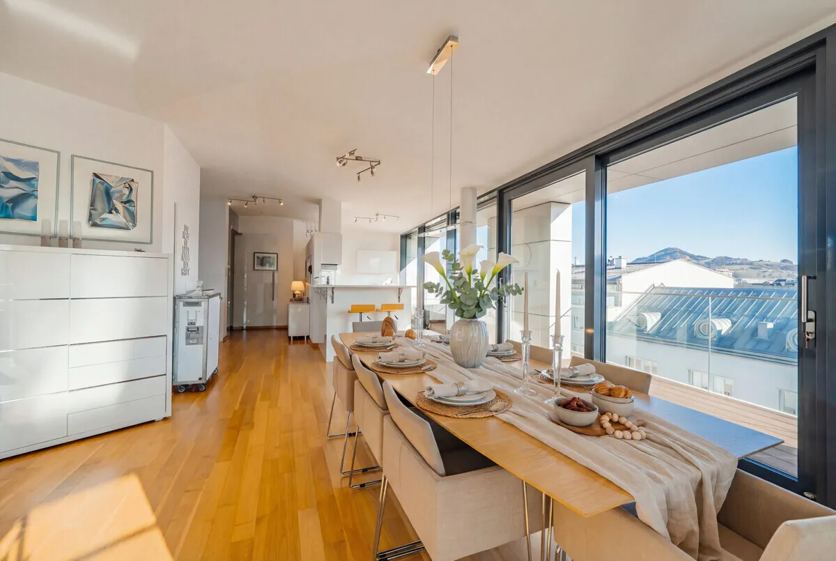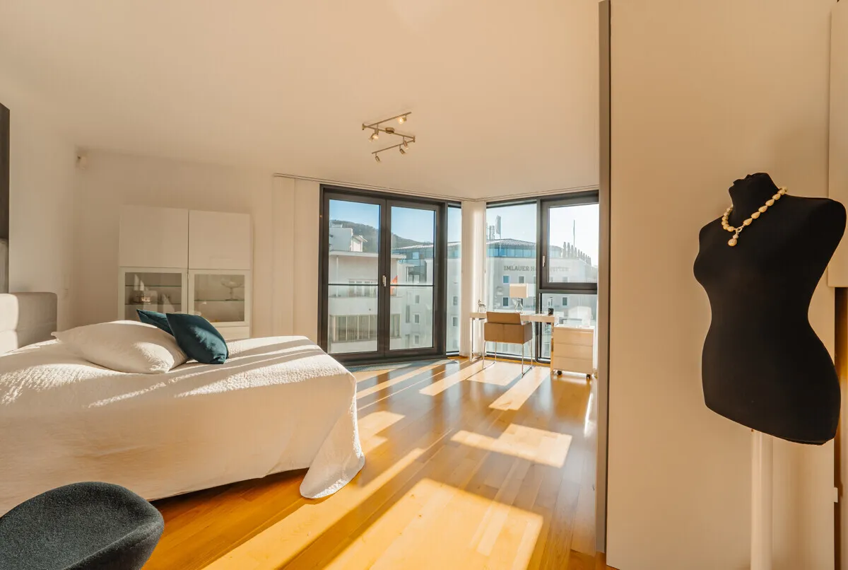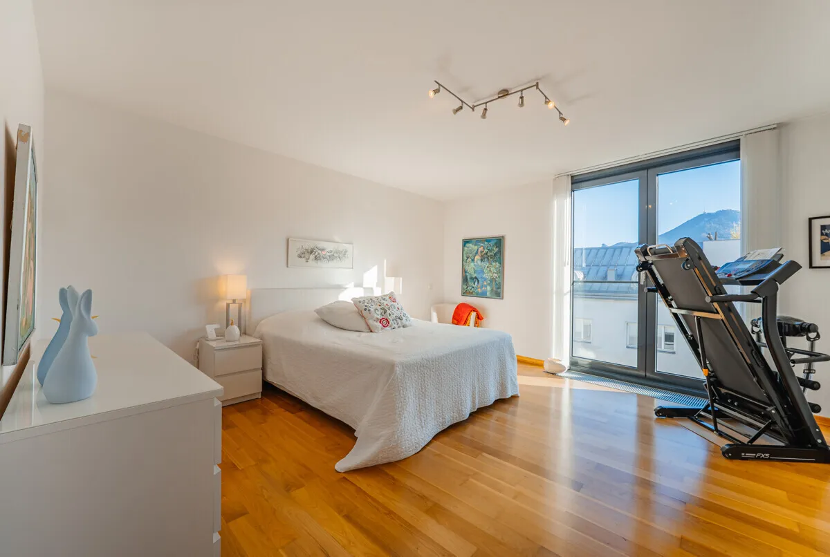 Situated above the rooftops of Salzburg, this maisonette with around 185 m² of living space not only offers a generous amount of space, but above all a feeling of space, freedom and privacy. The well thought-out room layout, generous window areas and elevated position create a living atmosphere that harmoniously combines lightness and elegance. A home for people who appreciate something special.