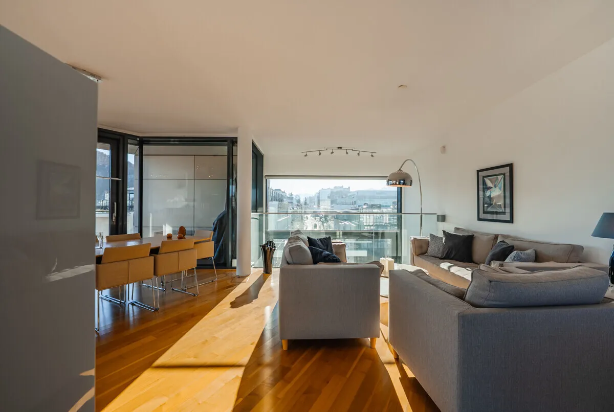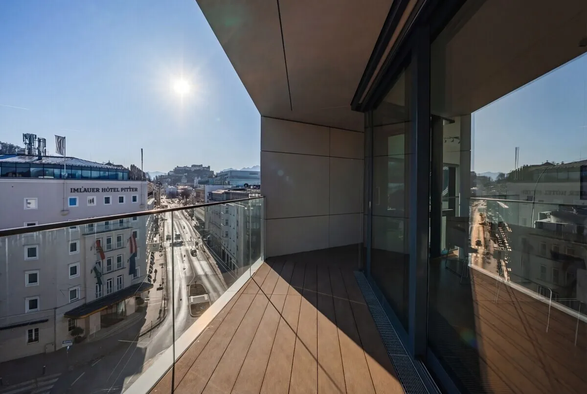 This extraordinary penthouse apartment extends over 2 floors and offers a very special living experience. The unobstructed view of the historic Salzburg fortress and cathedral as well as the rooftops of the city and the surrounding city mountains give this property a rarity that is second to none. Floor-to-ceiling windows bring the panorama directly into the living space and create an impressive connection between the inside and outside world.