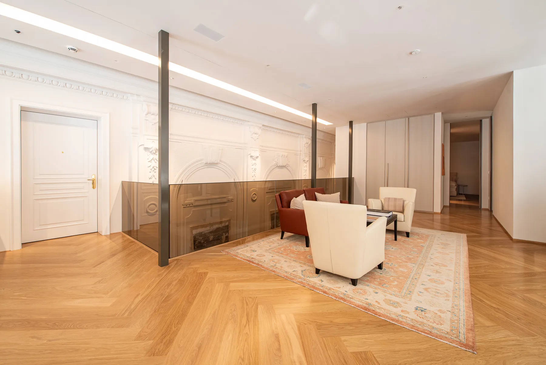 The apartment comprises a total of three bedrooms, each with its own en-suite bathroom. One bedroom of approx. 20 m² with a generously sized bathroom of around 20 m² is located on the lower level. Two additional bedrooms, also with en-suite bathrooms, are situated on the upper floor. In addition, an open gallery space of about 56 m² offers an excellent area to be used as a workspace, library, or presentation space for art and design.