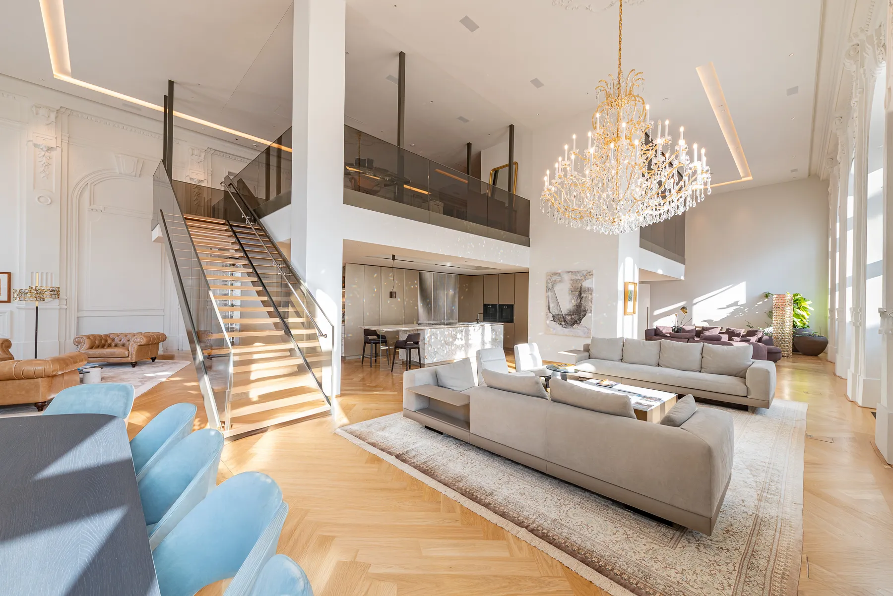The palace itself offers further amenities that make this property truly unique. A concierge service in the prestigious lobby provides security and convenience. A private wine cellar is available to residents, and a spacious storage unit is naturally included with the apartment. Optionally, an XL parking space in the underground garage of the building can be purchased.